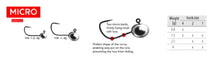 Dragon V-Point Micro Jig Heads feature a high carbon steel hook. The hooks are super strong and have two fine barbs located on opposite sides of the shank for stable bait presentation while the micro weight head ensures a perfect balance of your softbait presentation.