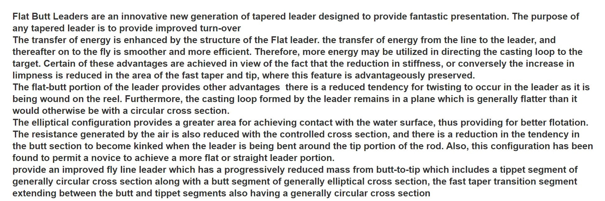 Flat Butt Leaders are an innovative new generation of tapered leader designed to provide fantastic presentation. The purpose of any tapered leader is to provide improved turn-over