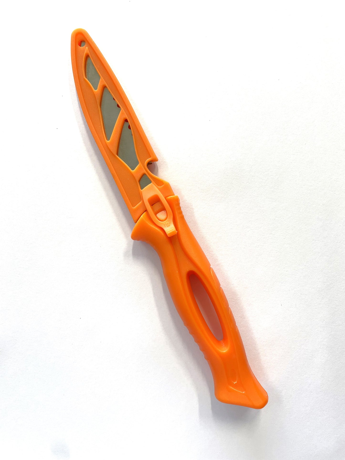 4' (10cm) bait knife with scaler and bottle opener, also comes with easy release clip lock sheath for safe storage.