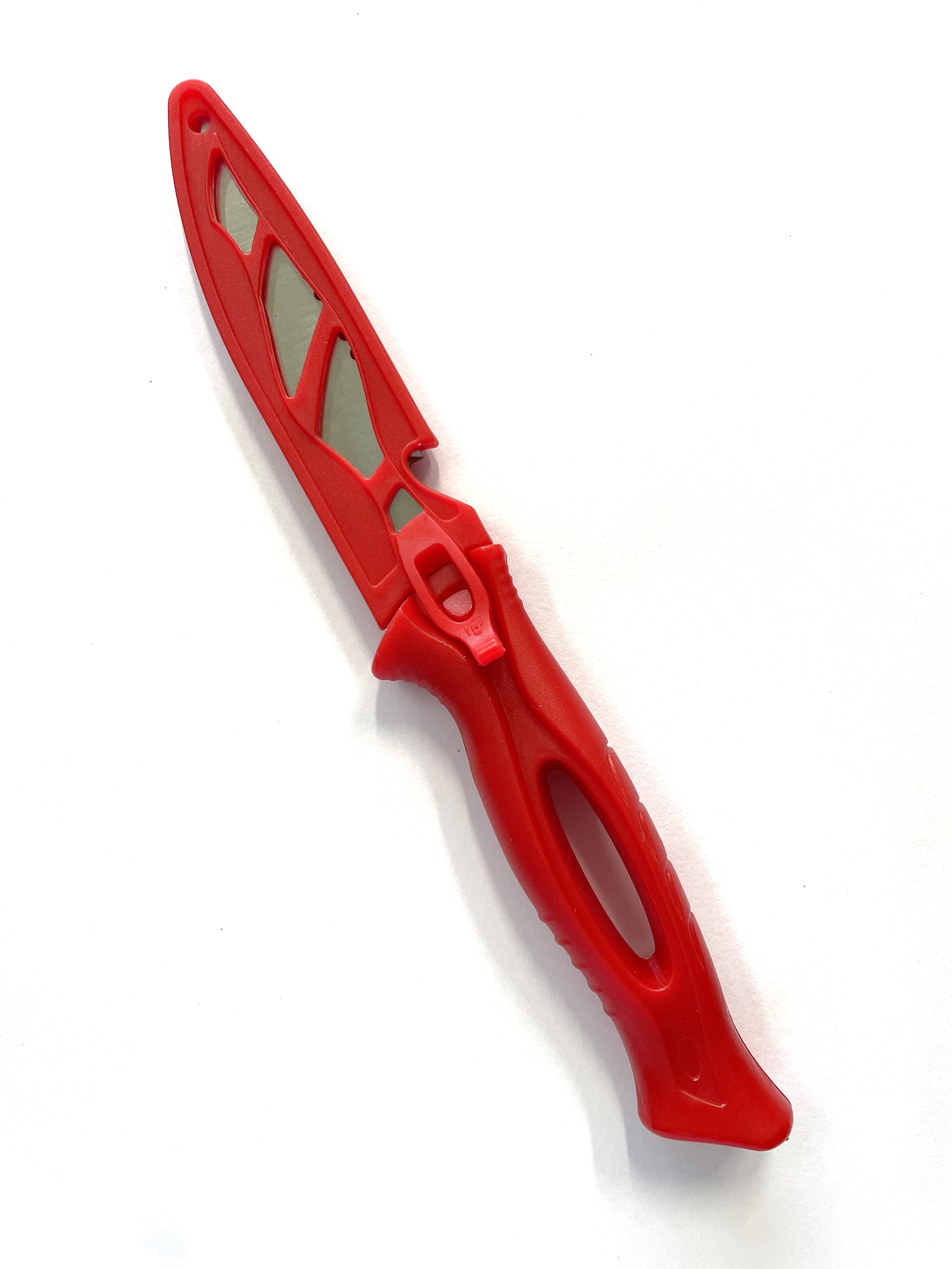 4' (10cm) bait knife with scaler and bottle opener, also comes with easy release clip lock sheath for safe storage.