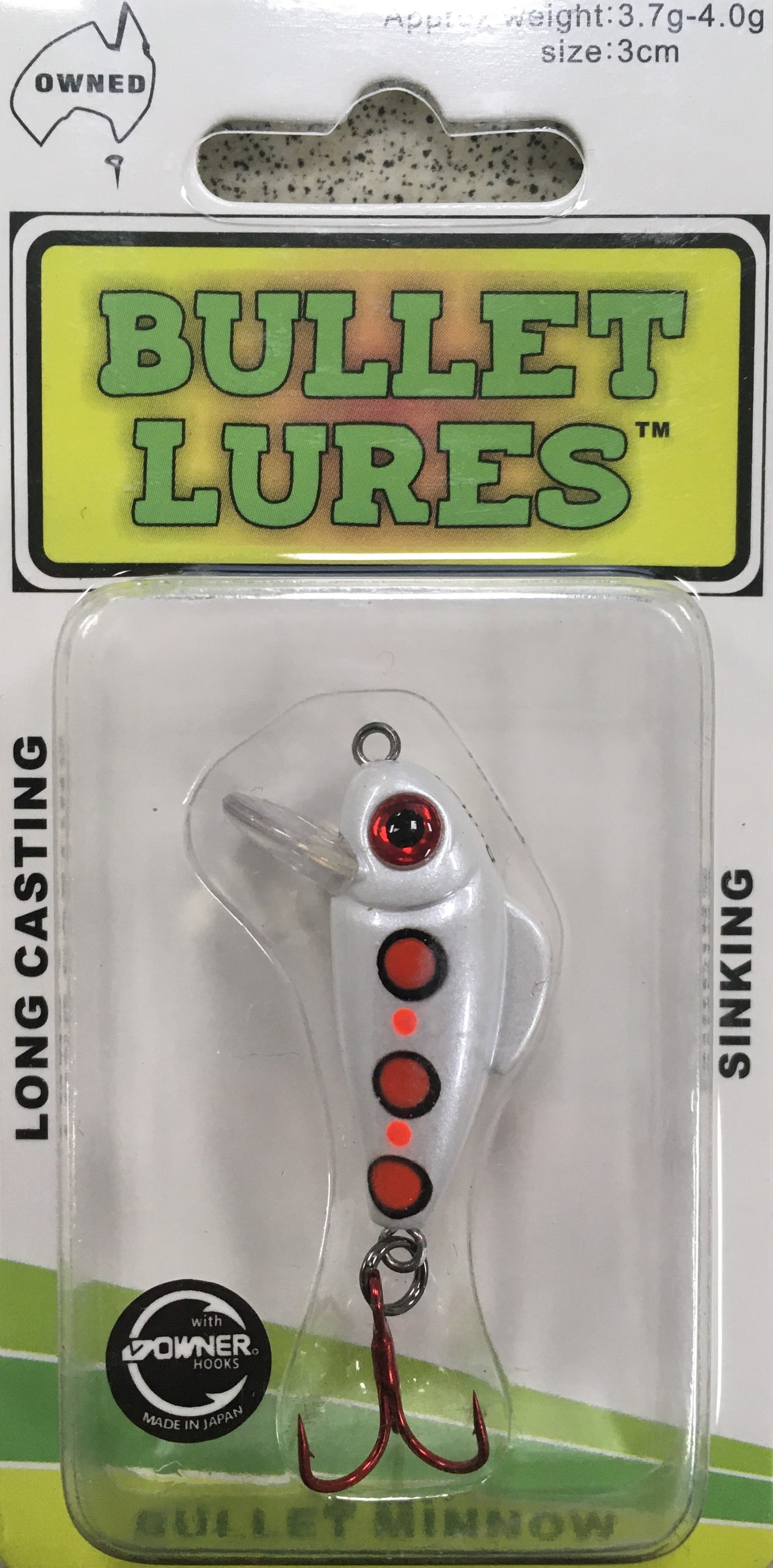 Only 3cm long and equipped with an OWNER treble. Designed for super long casting to cover a lot of water without spooking fish. They have an aggressive swim action that fish love to hit. I don’t know of any other hard body lure of the same size that can cast as far and this is why its named the Bullet Minnow.