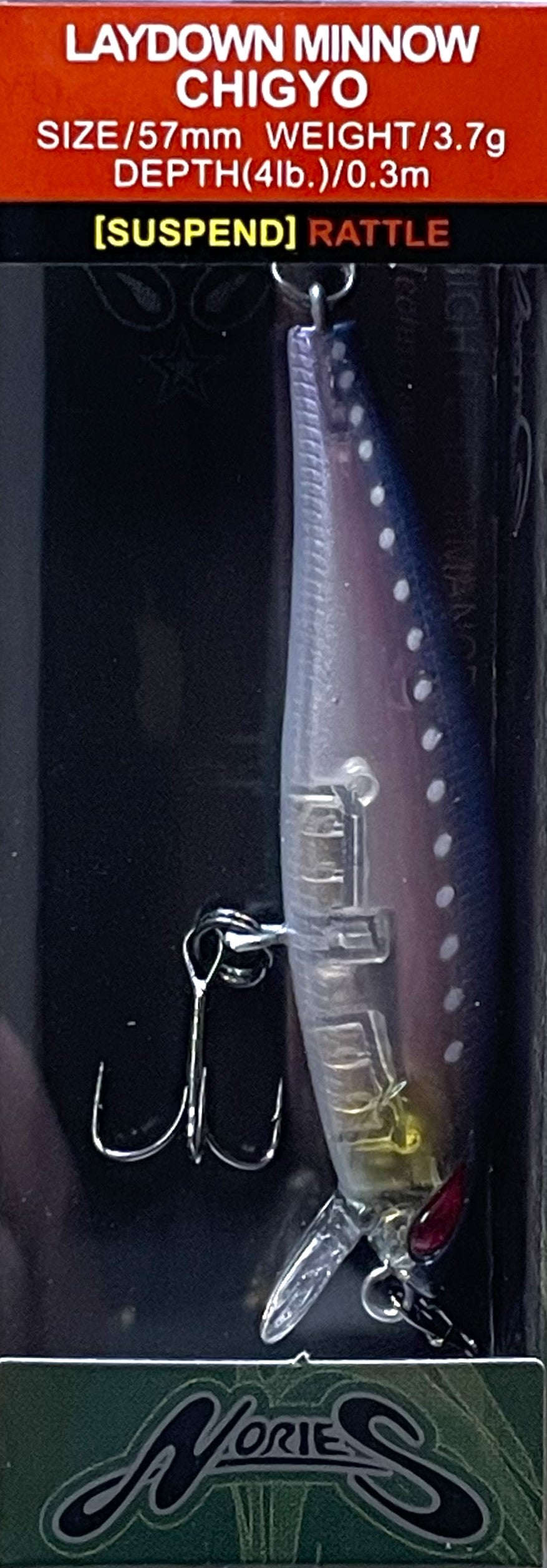 The Nories Laydown Minnow Chigyo is a shallow diving jerk bait ideal for working flats and banks with structure, over weed beds and flooded margins. This lure works best with a jerking retrieve to achieve optimal action and flash.