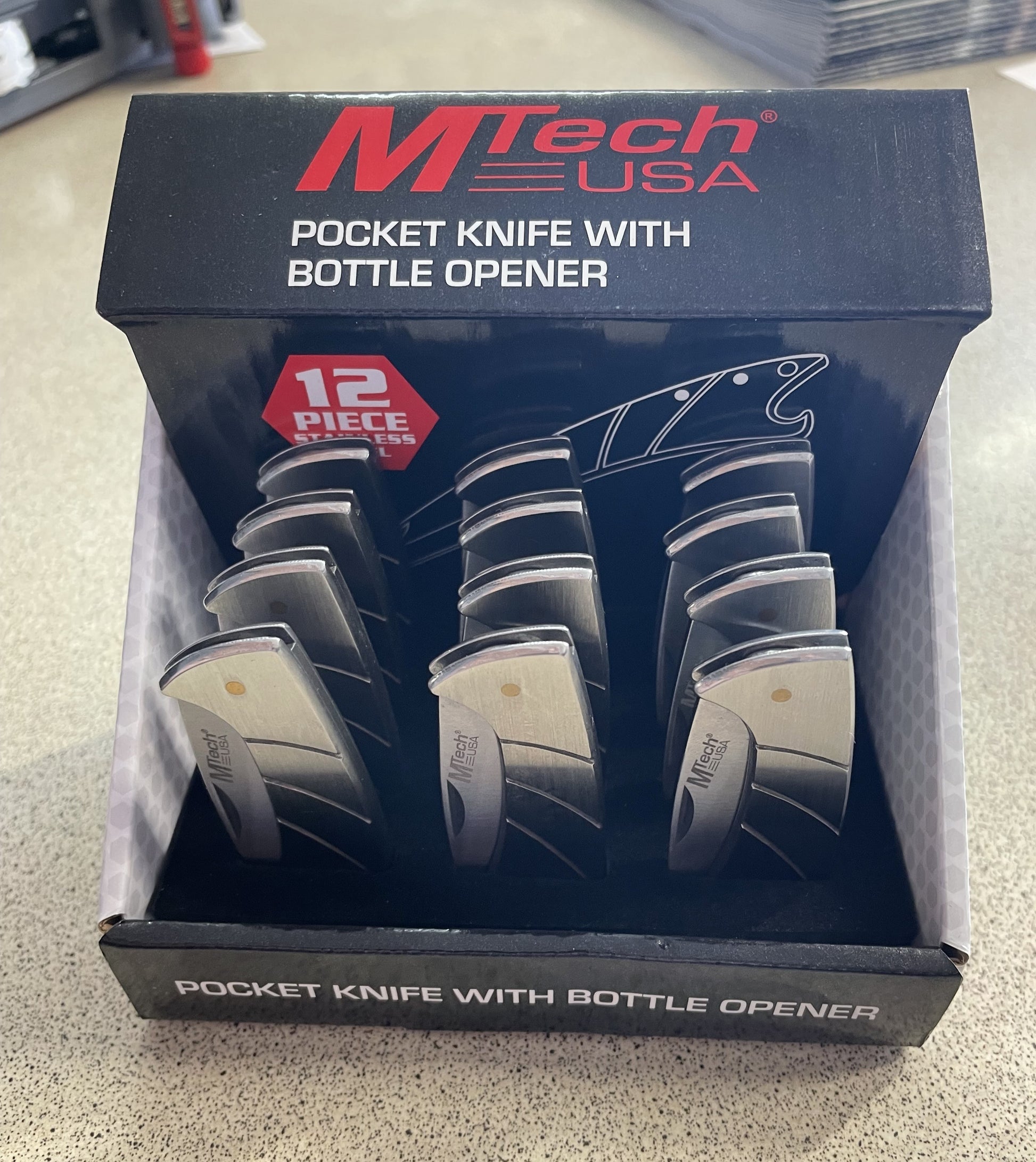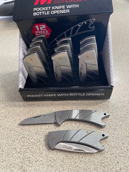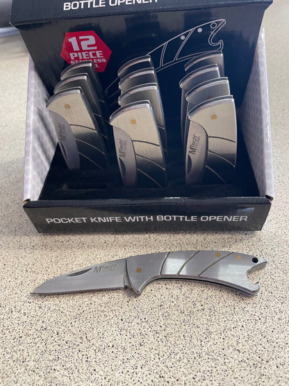 This compact Stainless Steel pocket knife features a handy bottle opener
